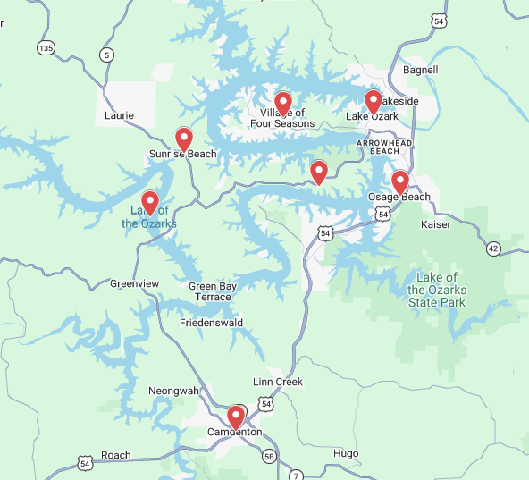 Central lake location with mixed residential and commercial development. TXR navigates Camden County permits and Ameren shoreline requirements for custom lakefront homes and commercial spaces.